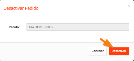 3. Una vez que se muestre la ventana Desactivar Pedido, debe dar clic en el botón Desactivar.