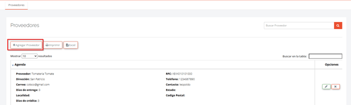 2. Dar clic en el botón Agregar Proveedor.